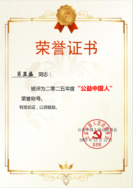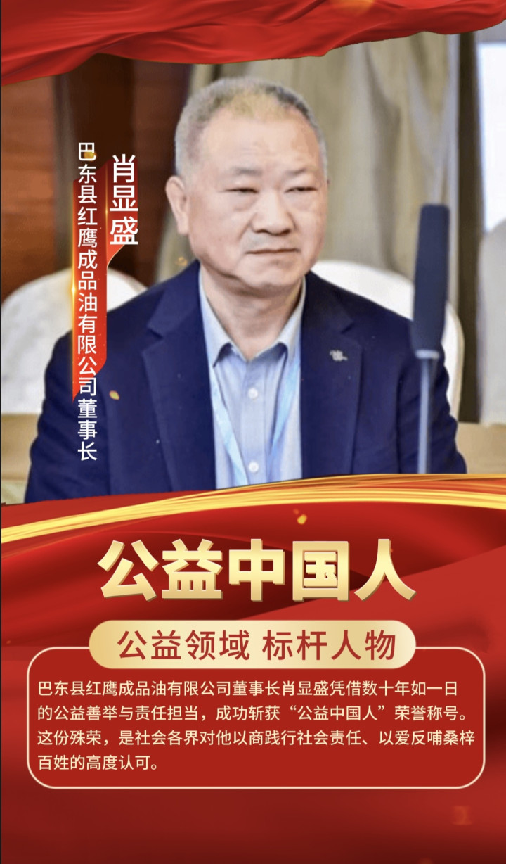 本报讯 近日,备受瞩目的“公益中国人”评选结果正式公布,巴东县红鹰成品油有限公司董事长肖显盛凭借多年来深耕公益、反哺桑梓的卓越贡献,成功摘得这一荣誉。这份沉甸甸的奖项,是社会各界对他以诚信经营筑牢企业根基、以无私善举践行社会责任的高度认可,更是对他二十余载坚守公益初心的生动褒奖。